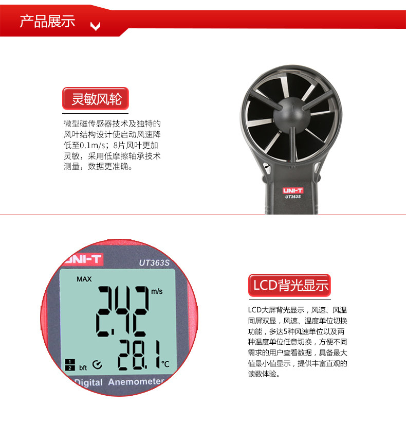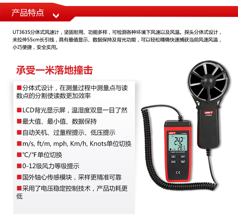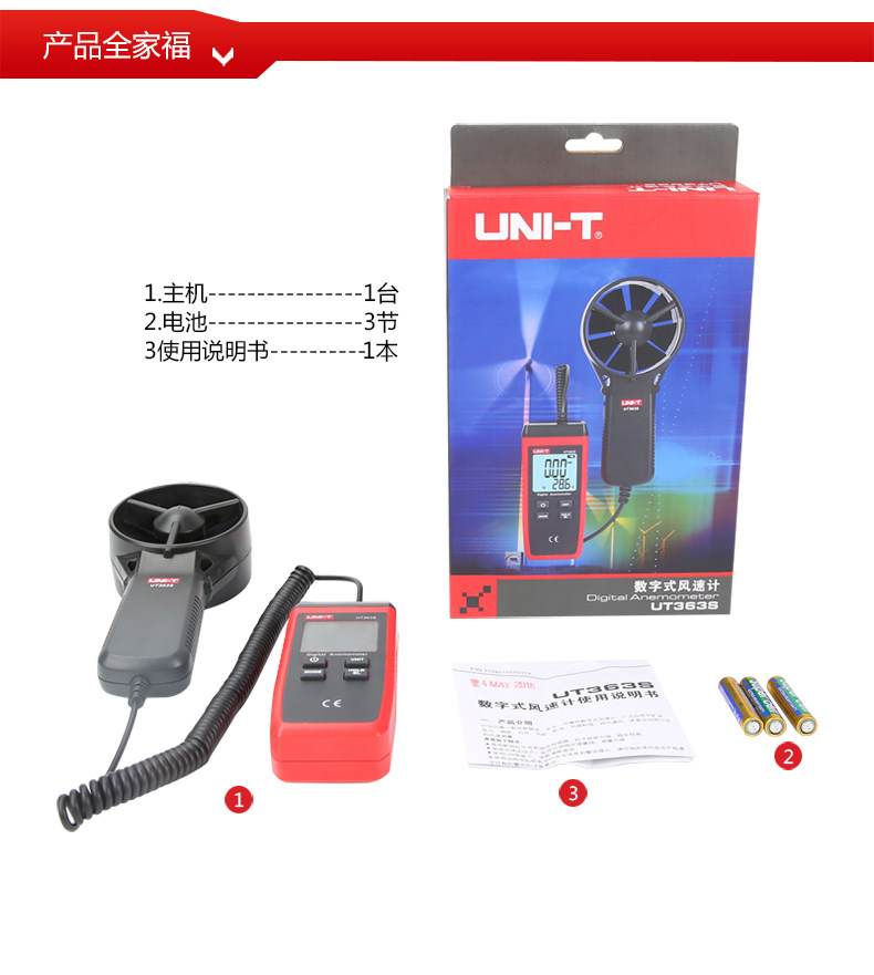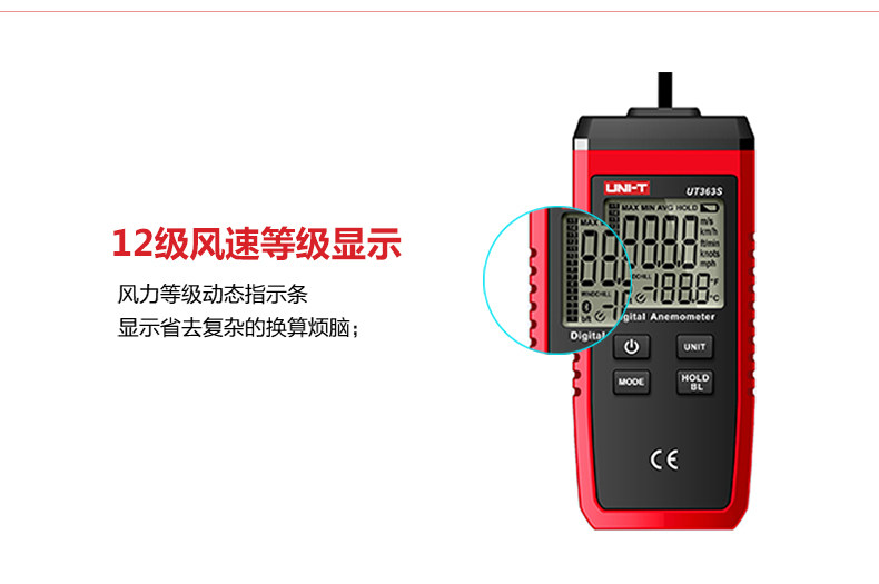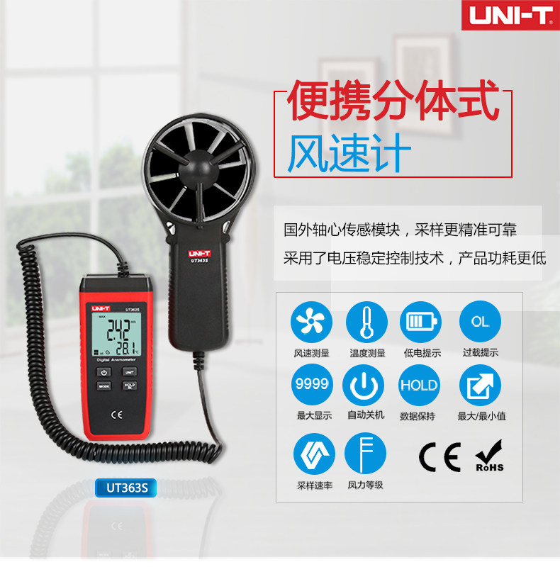 • 优利德UT363S便携风速计测试仪手持分体式测风仪高精度数字风速计